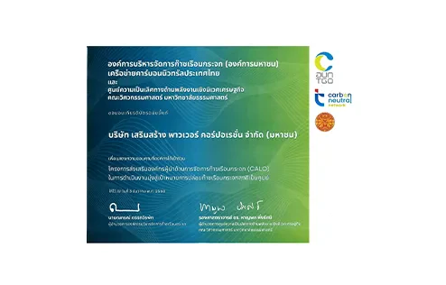 The Company has been honored by the Thailand Greenhouse Gas Management Organization (Public Organization) (TGO) in collaboration with the Thailand Carbon Neutral Network (TCNN). We received this recognition as a designated 'Pilot Organization', highlighting our distinction in concrete and tangible carbon management. This achievement underscores our goal to drive the organization toward Carbon Neutrality and Net Zero emissions