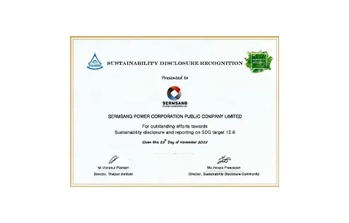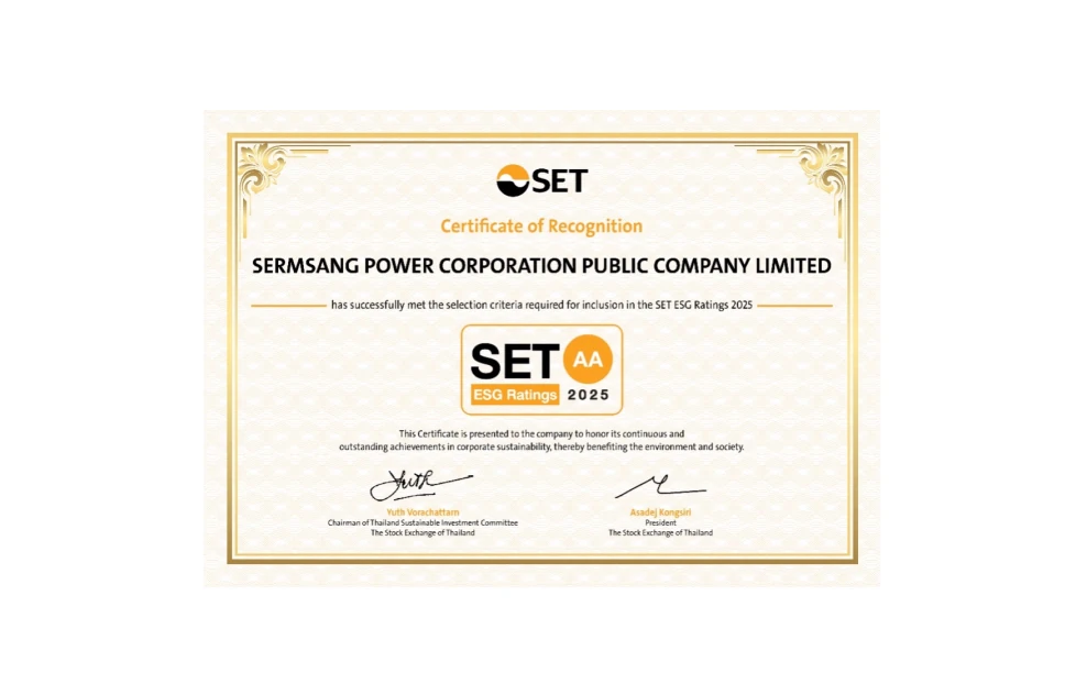 Sermsang Power Corporation Public Company Limited has been evaluated under the SET ESG Ratings and has received an "AA" rating for the second consecutive year. This sustainability assessment reflects the company’s commitment and emphasis on driving business toward sustainable growth.