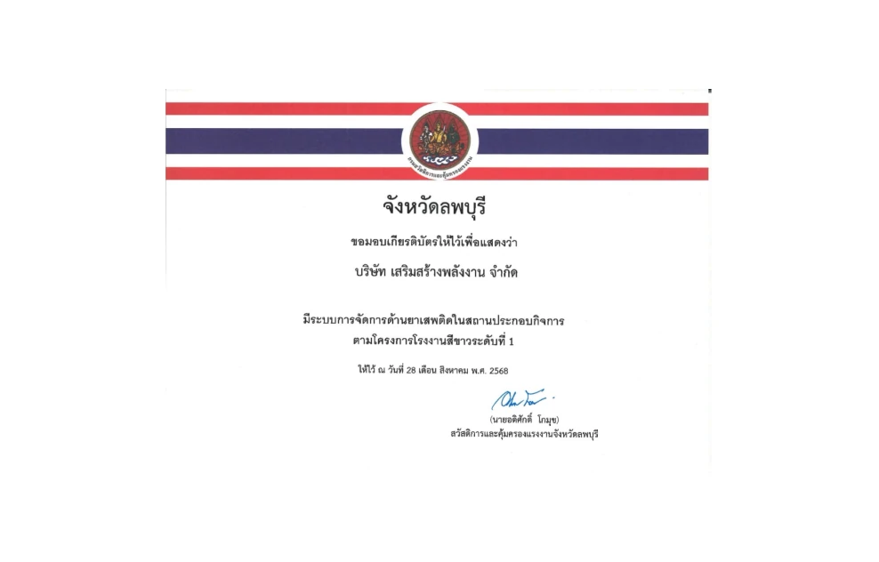 Sermsang Palang Ngan Company Limited has been certified as a "White Factory (Level 1)" by the Lopburi Provincial Office of Labour Protection and Welfare.